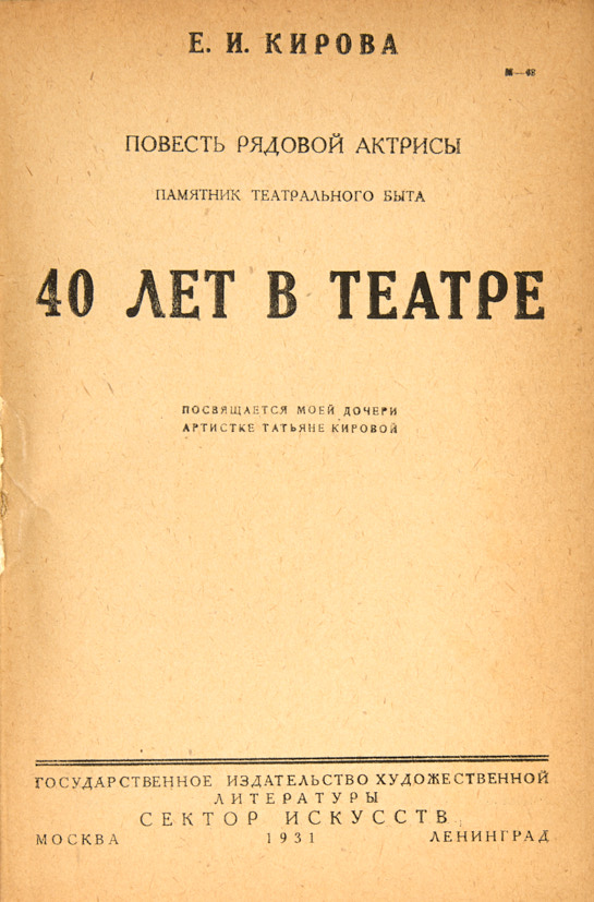 Кирова, Е.И. Повесть рядовой актрисы. Памятник театрального быта. 40 лет в театре. Посвящается моей дочери артистке Татьяне Кировой. М.; Л.: ГИХЛ, 1931.