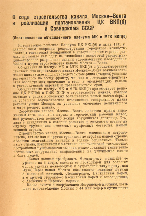 [Листовка]. О ходе строительства канала Москва-Волга и реализации постановления ЦК ВКП(б) и Совнаркома СССР. М., 1931.