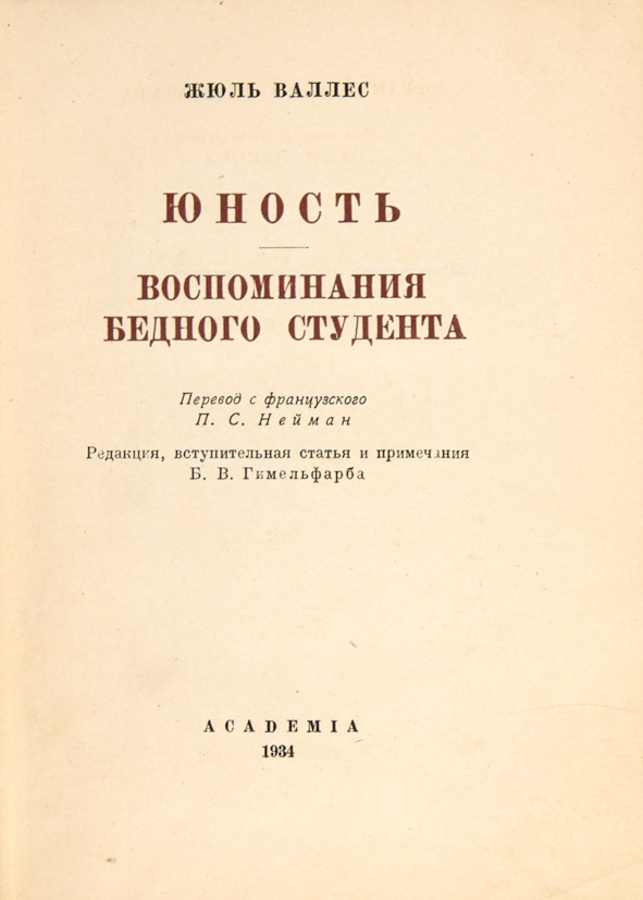 Валлес, Ж. Юность. Воспоминания бедного студента / пер. с фр. П.С. Нейман, под общ. ред. А.М. Эфроса, ред., вступ. ст. и прим. Б.В. Гимельфарба, рис., переплет и суперобложка раб. худ. М.С. Родионова. М., Л.: Academia, 1934.