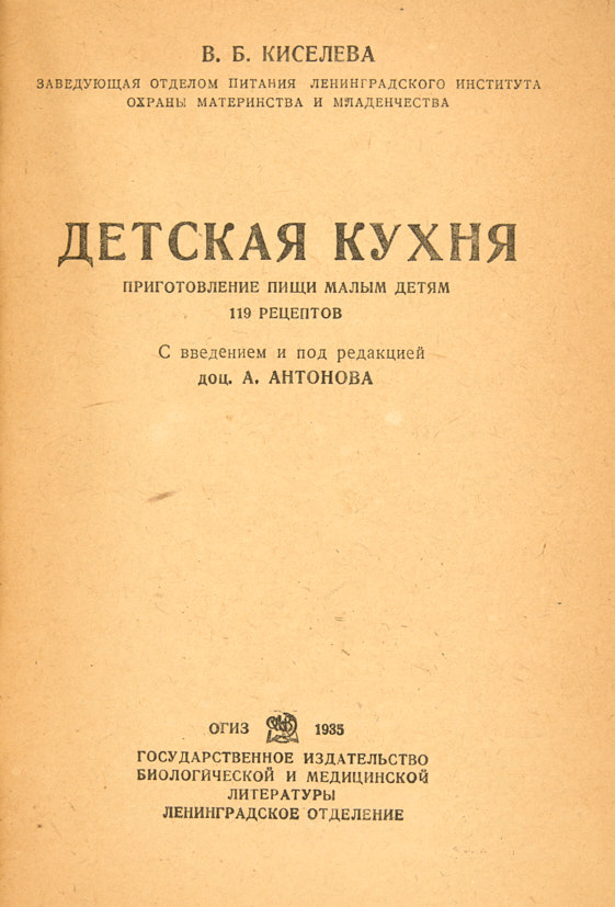Киселёва, В.Б. Детская кухня. Приготовление пищи малым детям / С введением и под ред доц. А. Антонова. Л.: ОГИЗ; БИОМЕДГИЗ, 1935.