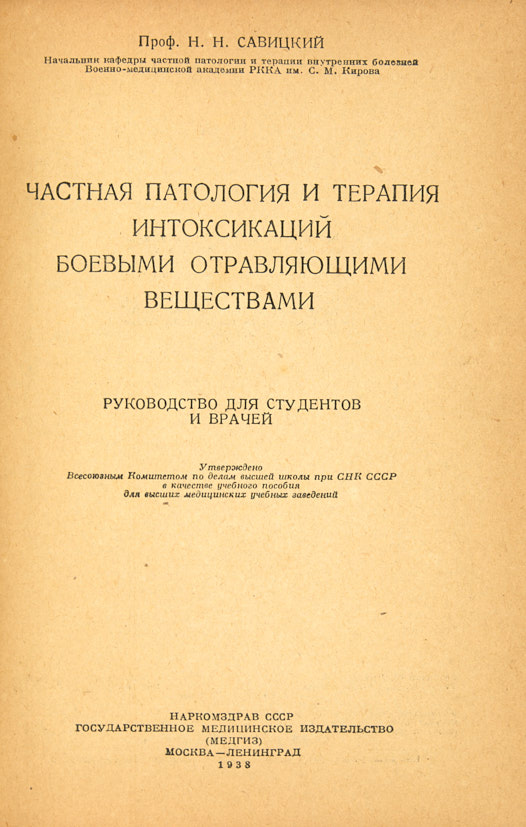 Савицкий, Н.Н. Частная патология и терапия интоксикаций боевыми отравляющими веществами. М.; Л.: НАРКОМЗДРАВ СССР; МЕДГИЗ, 1938.