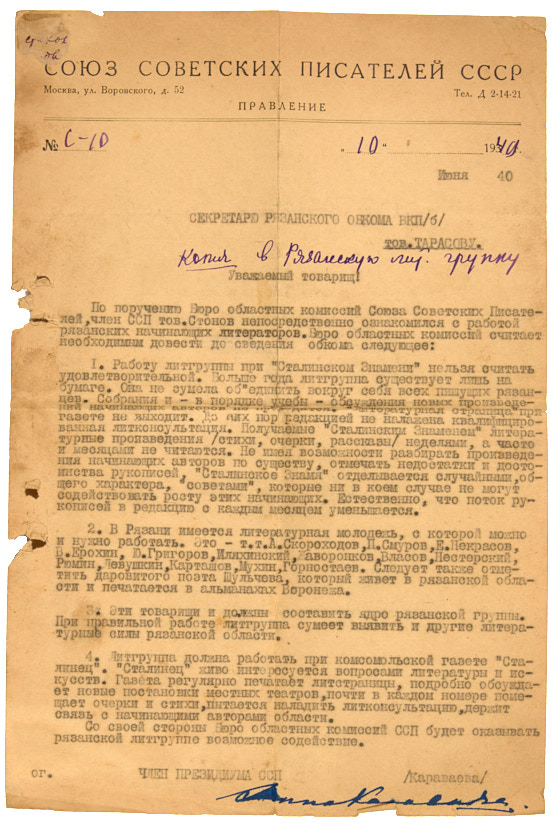 Караваева, А. [Автограф]. Письмо секретарю рязанского обкома ВКП(б). 1940.