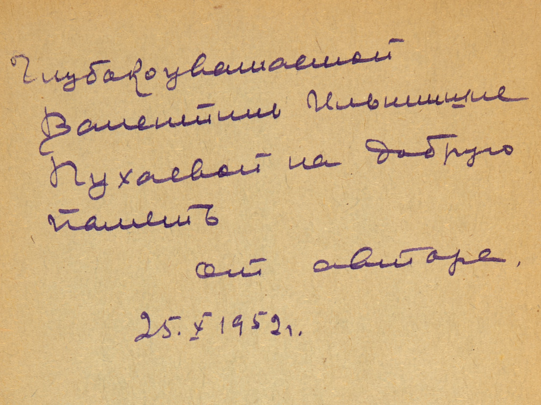 140, [4] с., ил. 20,2 х 14 см. В картонажном издательском иллюстрированном переплете, тканевый корешок. Потертости переплета, надлом переднего форзаца. На форзаце 2а автограф автора: «Глубокоуважаемой / Валентине Ильинишне / Пухаевой на добрую / память / от автора. / 25.X1952 г.».