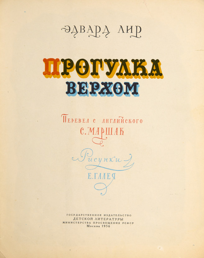 Лир, Э. Прогулки верхом / перевёл С. Маршак; рис. Е. Галея. М.: ДЕТГИЗ, 1956.