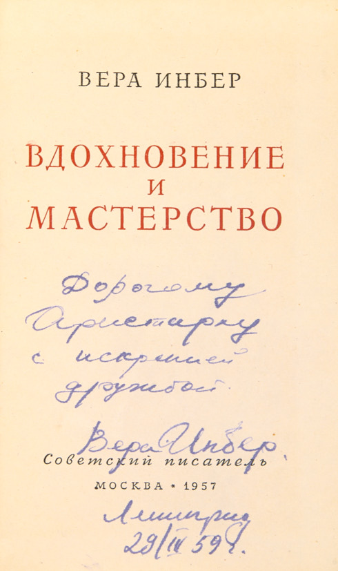 Инбер, В. [Автограф]. Вдохновение и мастерство. М.: «Советский писатель», 1957.