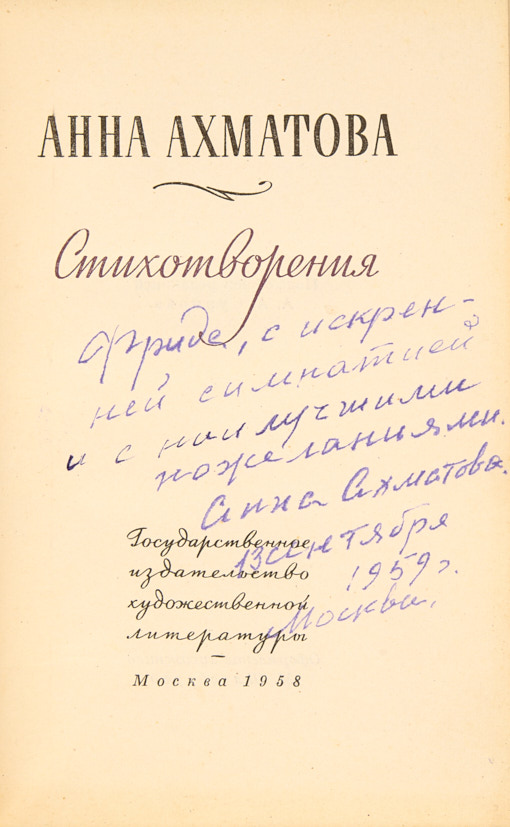 130, [2] c. 16,5 х 11 см. В издательском переплете. На титульном листе автограф: «Фриде, с искрен- / ней симпатией / и с наилучшими / пожеланиями / Анна Ахматова. / 13 сентября / 1959 г. / Москва».