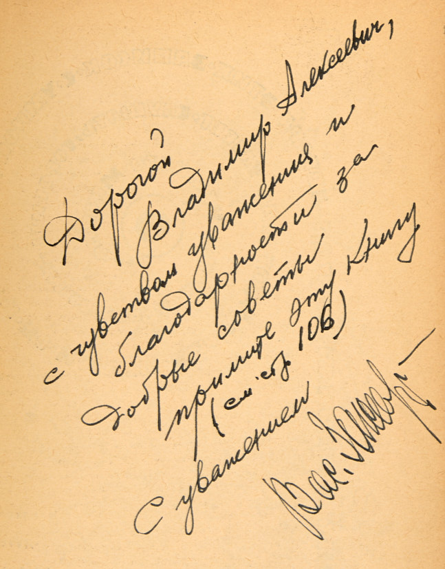 254, [2] с., ил. 20,7 х 14,8 см. В издательском переплете. Потертости краев переплета. На пустой стороне контртитула автограф: «Дорогой / Владимир Алексеевич, / с чувством уважения и / благодарности за / добрые советы / примите эту книгу / (см. стр. 106) / С уважением / [подпись]».