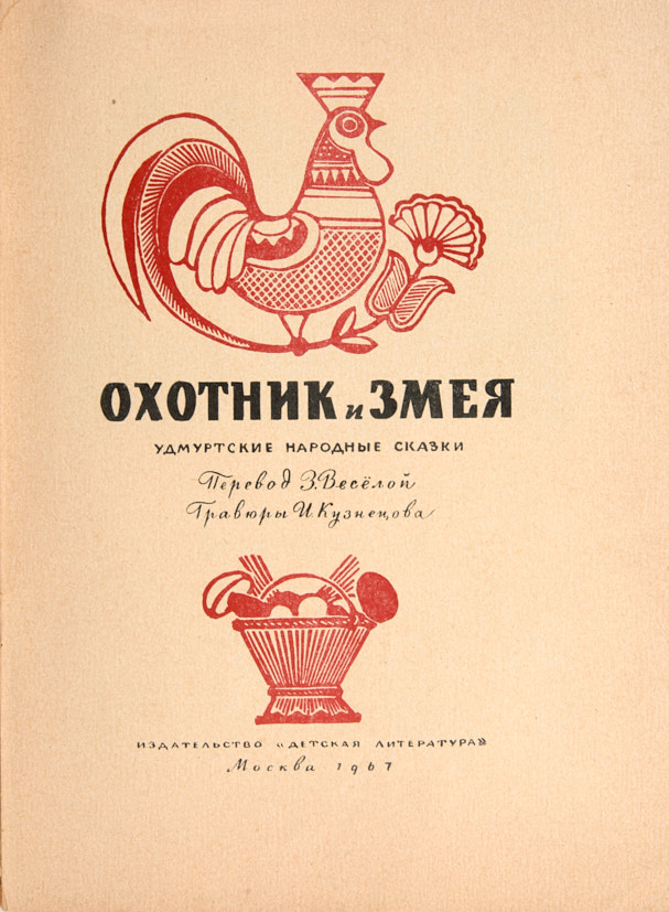 1. Охотник и змея. Удмуртские народные сказки / перевод В. Весёлой; гравюры И. Кузнецова. М.: «Детская литература», 1967. 14, [2] с., ил. 29,2 х 21,5 см. В иллюстрированной издательской обложке. Незначительные потертости и следы от сгиба обложки. В очень хорошем состоянии.