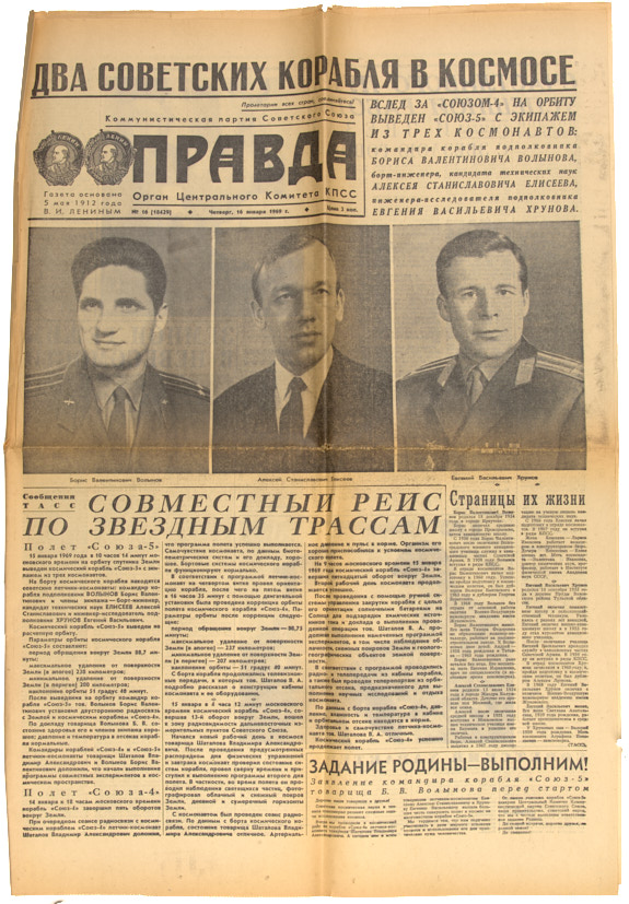 Номер газеты посвящен совместному полету кораблей "Союз-4" и "Союз-5", в ходе которого произошла первая в мире стыковка двух космических кораблей.