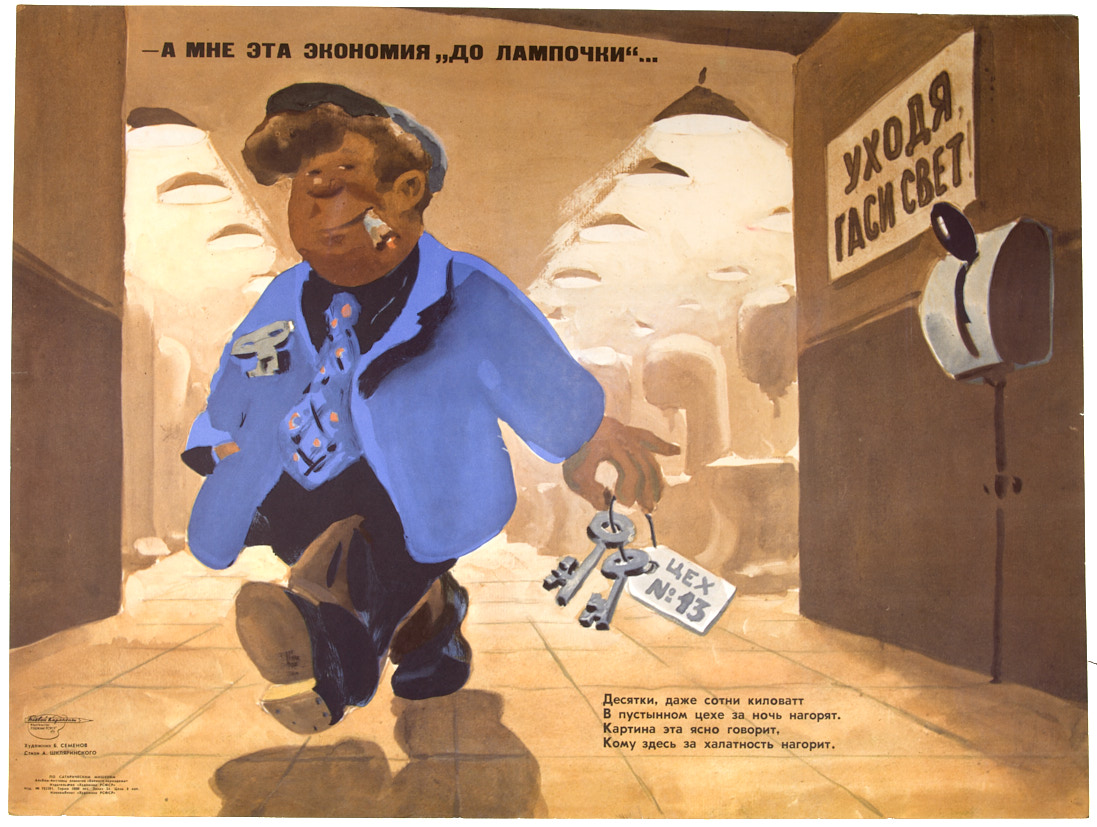 Плакат. Серия «Боевой карандаш». А мне эта экономия «до лампочки»... / худ. Б. Семенов. [Л.]: Изд-во Художник РСФСР, 1970-е.