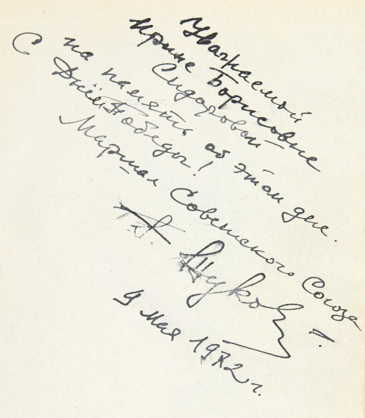 704 c. 22 x 14,5 см. В издательском переплете и суперобложке. Мелкие надрывы суперобложки. На свободном листе форзаца дарственная надпись: «Уважаемой / Ирине Борисовне / Сидоровой / на память об этом деле / С Днем Победы! / Маршал Советского Союза / Г. Жуков / 9 мая 1972»