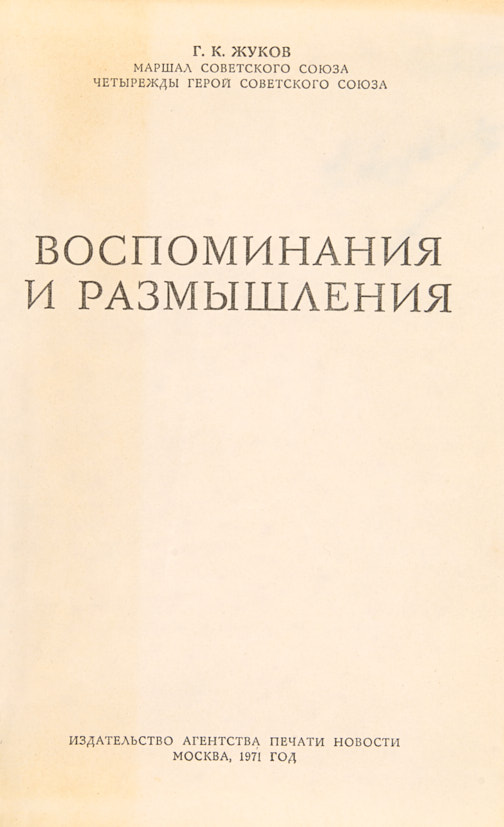 Жуков, Г. [Автограф]. Воспоминания и размышления. М.: Изд-во Агентства печати Новости, 1971.