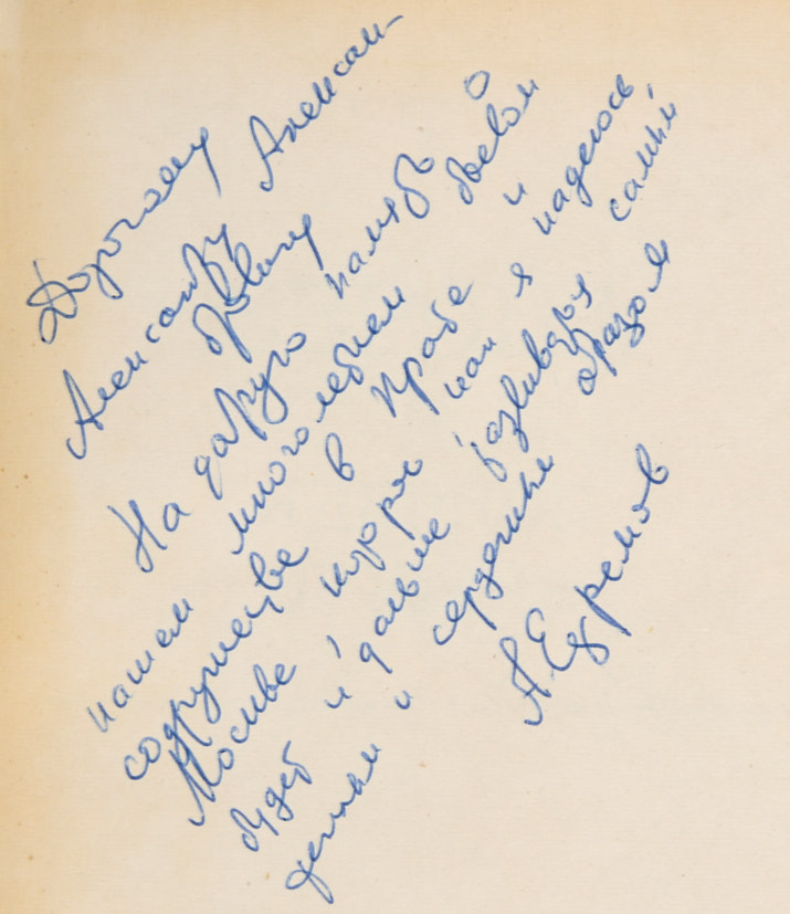 389, [3] с. 20,6 х 13,5 см. В издательском переплете. На форзаце 1б автограф: «Дорогому / Александру / Алексан- / дровичу / На добрую память о / нашем многолетнем боевом / содружестве в Праге и / Москве, которое, как я надеюсь, / будет и дальше развиваться самым / [нрзб.] и сердечным образом А. Ефремов».