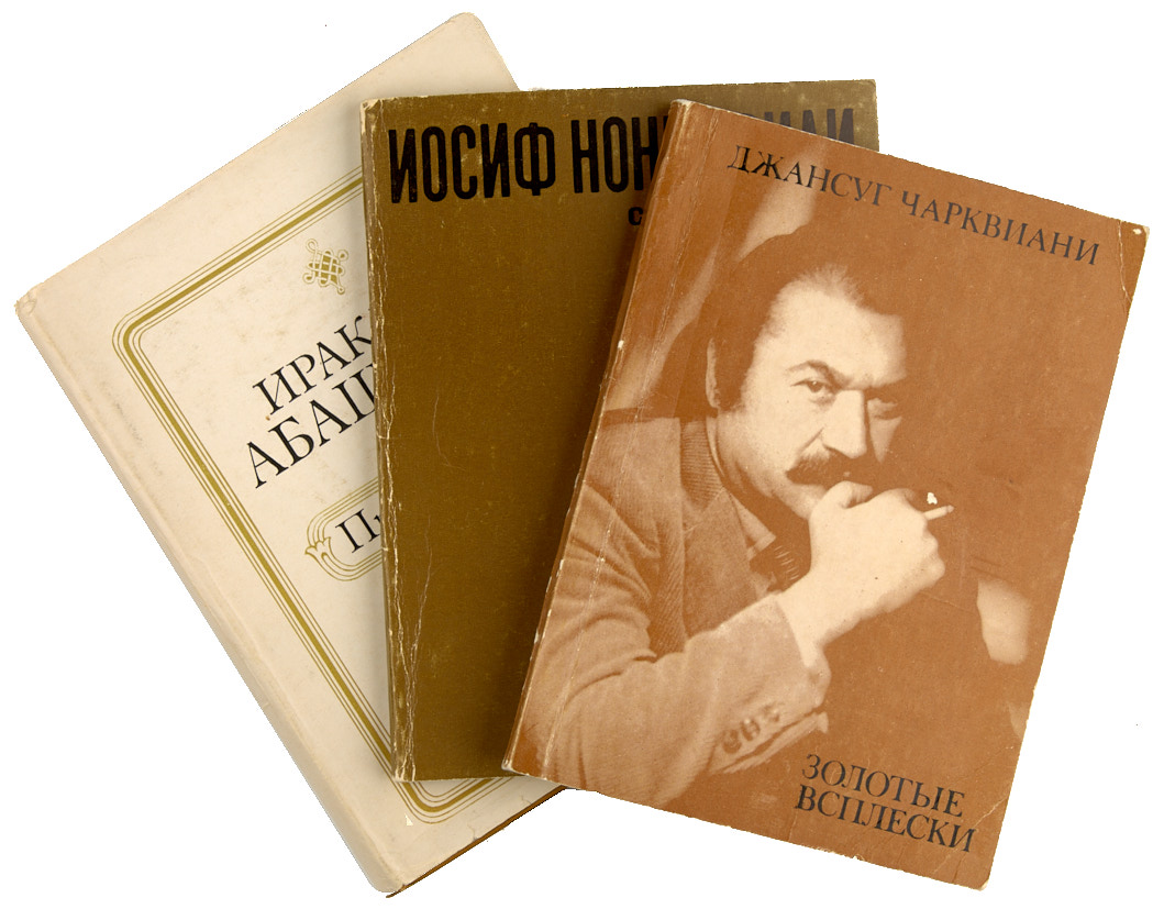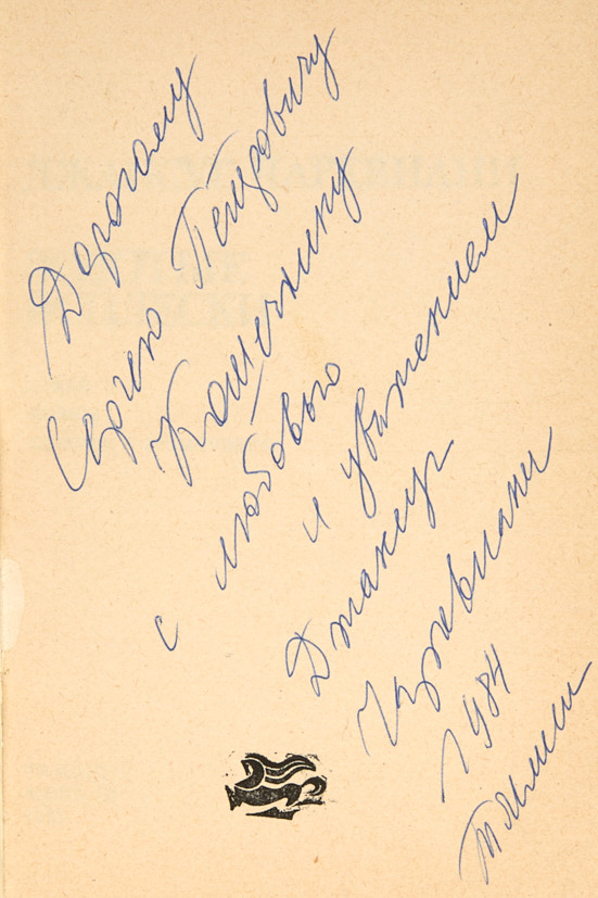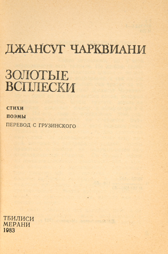 3. Чарквиани, Д. [Автограф]. Золотые всплески. Стихи. Поэмы / перевод с груз. Тбилиси: «Мерани», 1983. 247, [1] с. 16,7 х 12 см. В иллюстрированной издательской обложке. На авантитуле дарственная надпись: «Дорогому / Сергею Петровичу / Кошечкину / с любовью / и уважением / Джансуг / Чарквиани.».