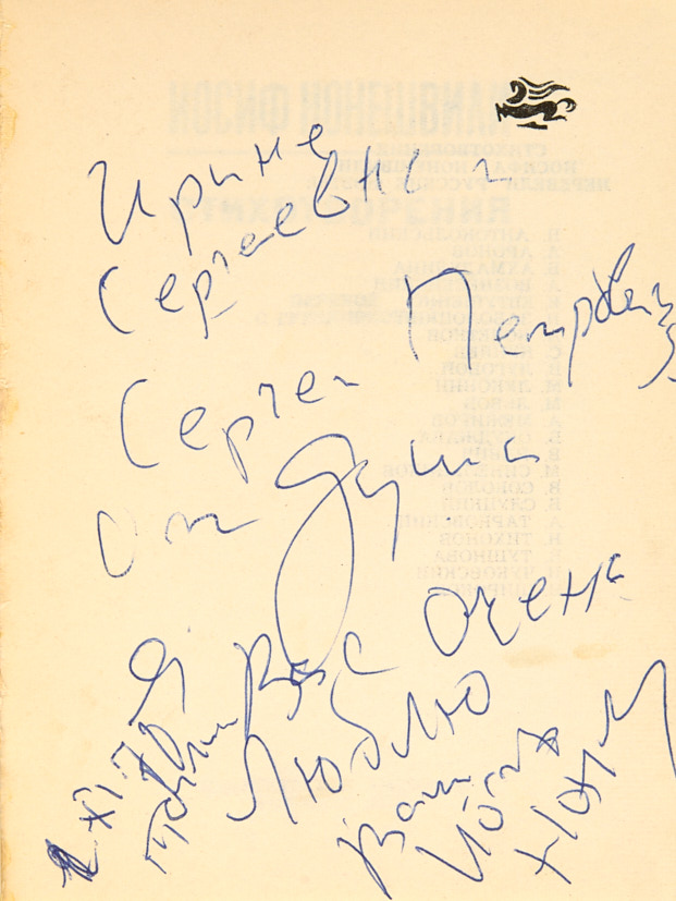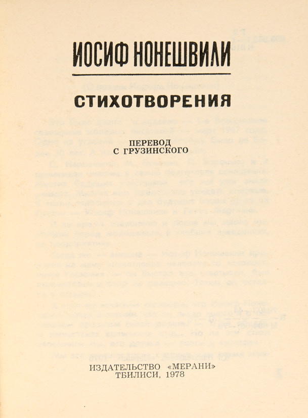 2. Нонешвили, И. [Автограф]. Стихотворения / перевод с груз. Тбилиси: Издательство «Мерани», 1978. 138, [2] с. 16,5 х 12,6 см. В иллюстрированной издательской обложке. Потертости обложки. На авантитуле дарственная надпись: «Ирине / Сергеевне и / Сергею Петровичу / от души / Я вас очень / люблю / Ваш / Иосиф / Нонешвили».