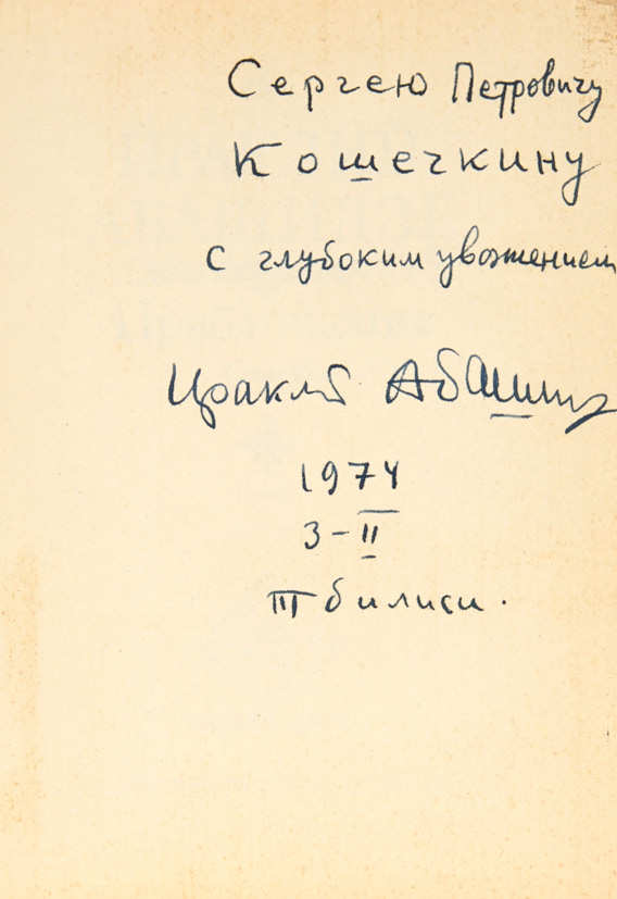1. Абашидзе, И. [Автограф]. Приближение. Стихи / перевод с грузинского. М.: «Советский писатель», 1973. 222, [2] с. На форзаце 2а дарственная надпись: «Сергею Петрович / Кошечкину / с глубоким уважением / Ираклий Абашидзе / 1974 / 3-II / Тбилиси.».