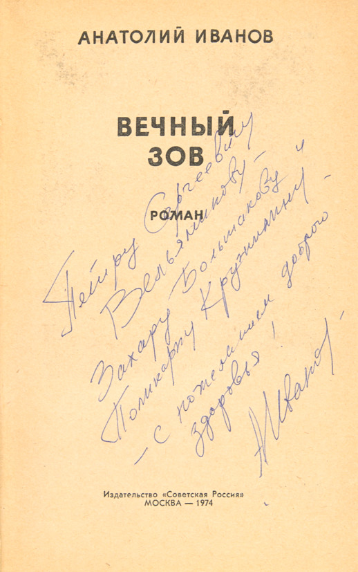 Иванов, А. [Автограф?]. Вечный зов. Роман. М.: «Советская Россия», 1974.
