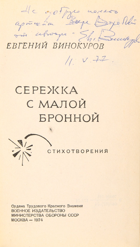 Винокуров, Е. [Автограф?]. Серёжка с малой Бронной. М.: Воениздат, 1974.