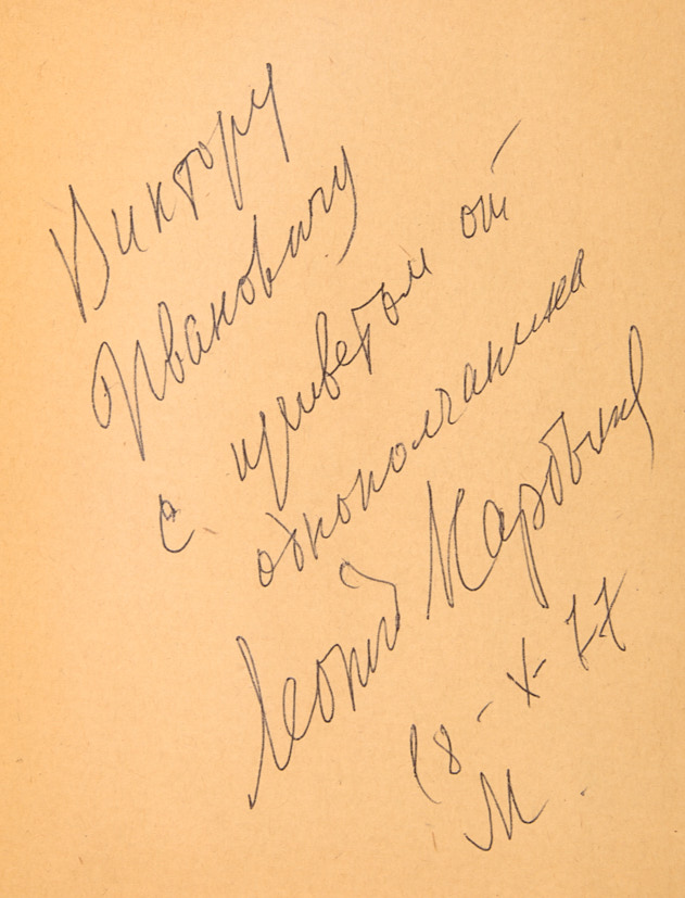 255, [1] с. 17 х 13 см. В коленкоровом издательском переплете с золотым и блинтовым тиснением. На форзаце 2а автограф: «Виктору / Ивановичу / с приветом от / однополчанина / Леонид Мартынов / 18-X-77 / М.».