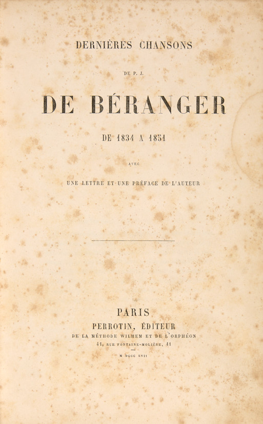 [Беранже, П-Ж. Последние песни]. Beranger, P.J. Dernieres chansons. Paris: Perrotin, 1857.