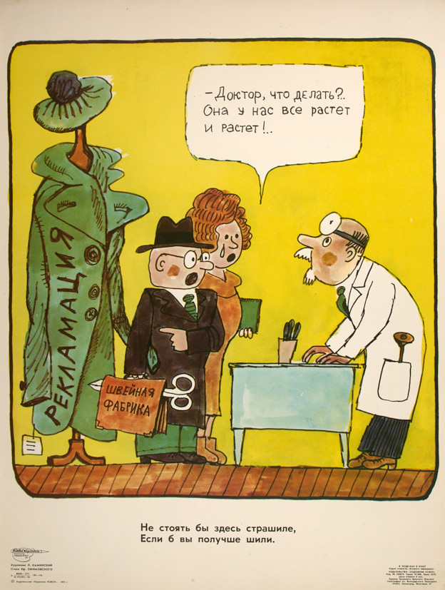 Плакат. Серия «Боевой карандаш». Доктор, что делать?.. Она у нас все растет и растет!.. / худ. Л. Каминский. Л.: Изд-во Художник РСФСР, 1977.