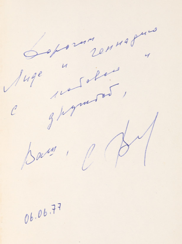 352 с. 20,7 х 13,5 см. В издательском переплете. На форзаце 1б автограф: «Дорогим / Лиде и Геннадию / с любовью и / дружбой, / Ваш / [подпись] / 06.06.77».
