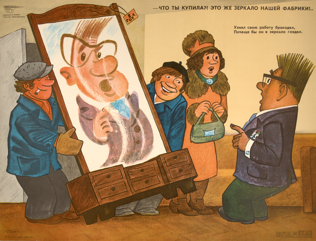 Плакат. Серия «Боевой карандаш». Что ты купила?! Это же зеркало нашей фабрики!.. / худ. В. Травин. Л.: Изд-во Художник РСФСР, 1978.