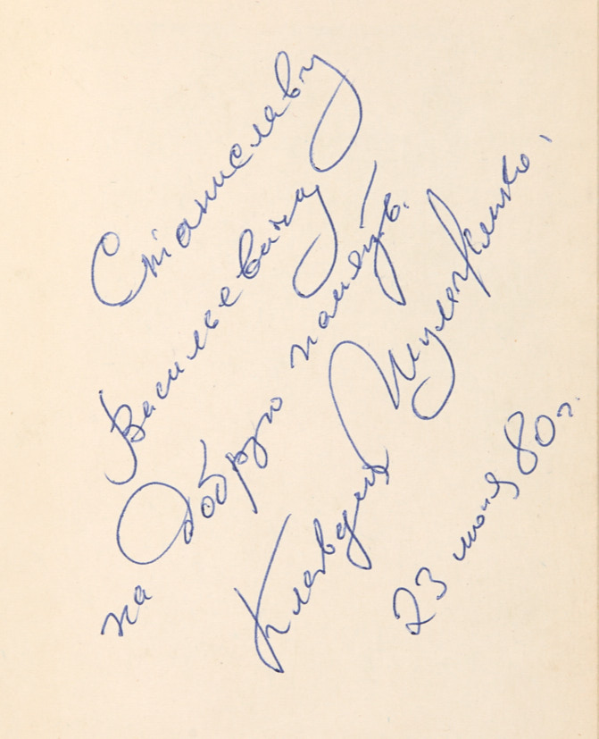 1 л. фронт., 176 с., ил. 17,1 х 11,2 см. В ледериновом издательском переплете. На форзаце 2а дарственная надпись: «Станиславу / Васильевичу / на добрую память. / Клавдия Шульженко. / 23 июня 80 г.».