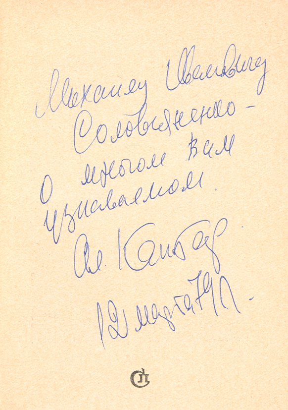 207 с., ил. 19,8 х 12,7 см. В издательской обложке. На обороте фронтисписа дарственная надпись автора: «Михаилу Ивановичу / Соловьяненко - / о многом Вам / узнаваемом. / Ал. Каптер / 12 марта 79 г.».