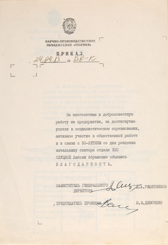 3. Благодарность Л.А. Слуцкой за многолетнюю добросовестную работу на предприятии. 1985. 29, 5 х 20,5 см.