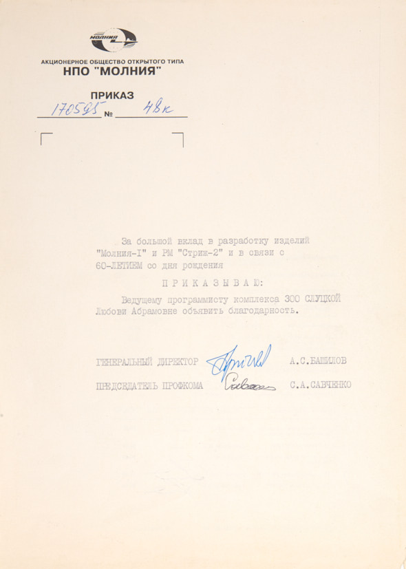 5. Благодарность Л.А. Слуцкой за большой вклад в разработку изделий Молния -I и РМ "Стриж-2". [1995]. 29, 5 х 20,5 см.