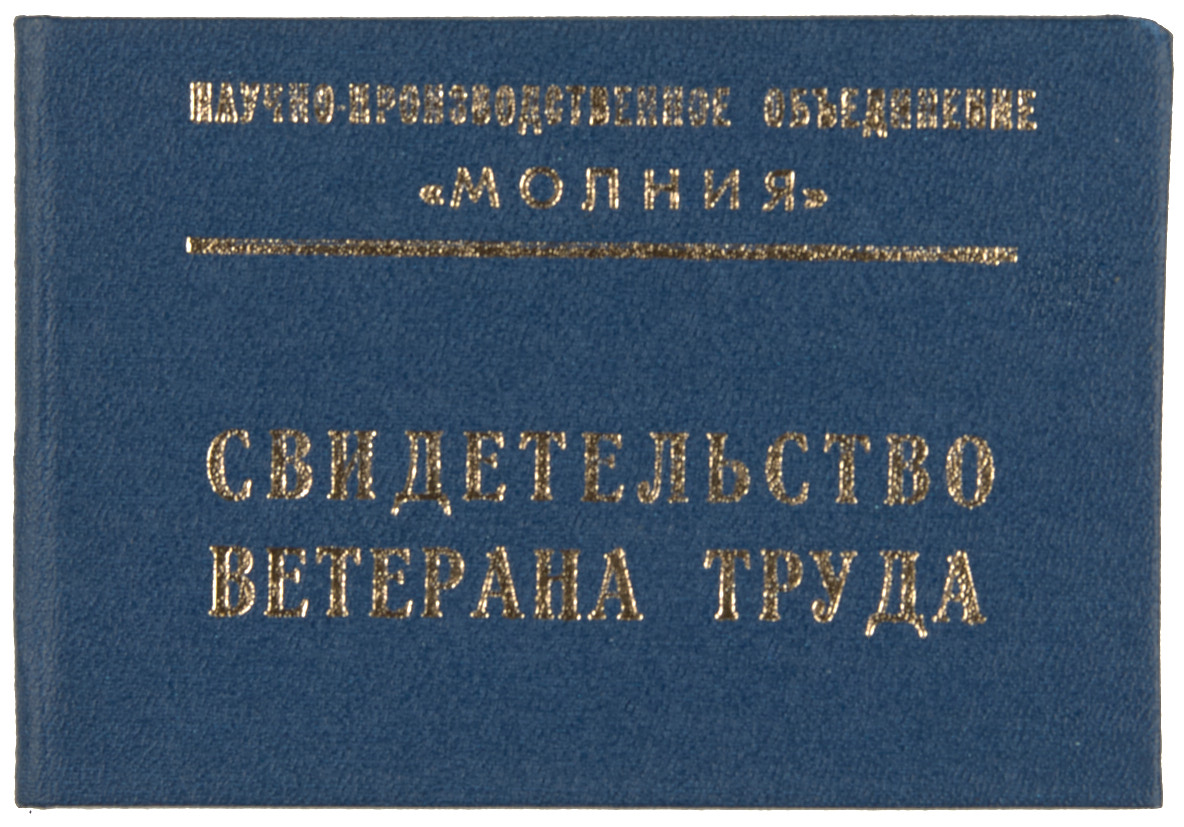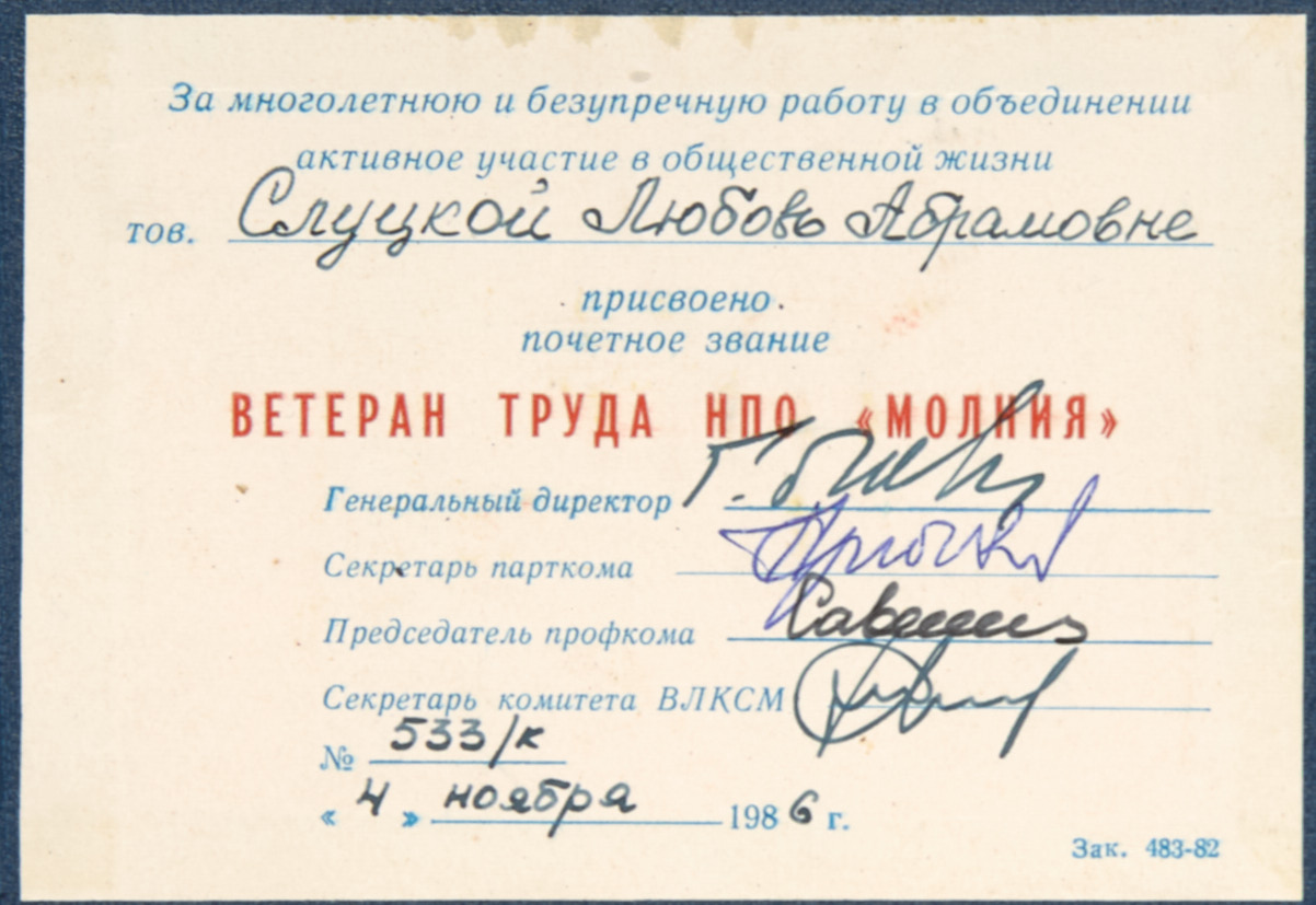 2. Лозино-Лозинский, Г. [Автограф]. Свидетельство ветерана труда НПО "Молния", выданное Л.А. Слуцкой. 1986. 12,5 x 8,5 см. Свидетельство подписано генеральным конструктором НПО "Молния" Глебом Евгеньевичем Лозино-Лозинским.