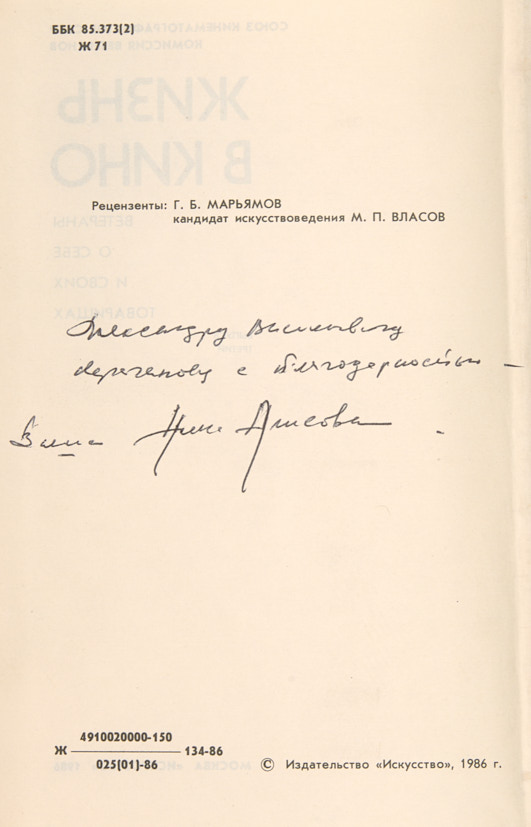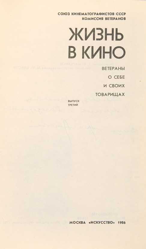 [Автограф Нины Алисовой?]. Жизнь в кино. Ветераны о себе и своих товарищах. М.: «Искусство», 1986.