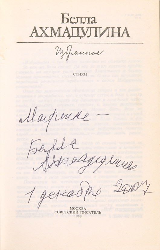 Ахмадулина, Б. [Автограф]. Избранное. Стихи. М.: Советский писатель, 1988.