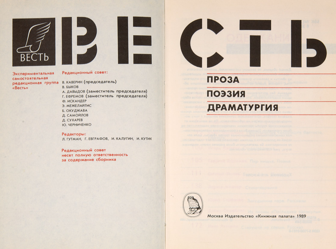 [Первая полная публикация повести «Москва-Петушки» в СССР]. Весть. Проза. Поэзия. Драматургия. М.: Книжная палата, 1989.