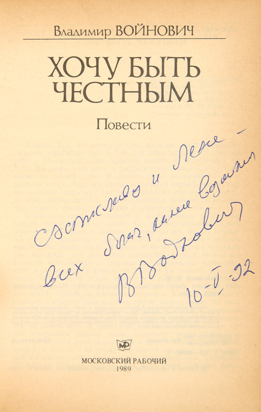 Войнович, В. [Автограф?]. Хочу быть честным. Повести. М.: «Московский рабочий», 1989.