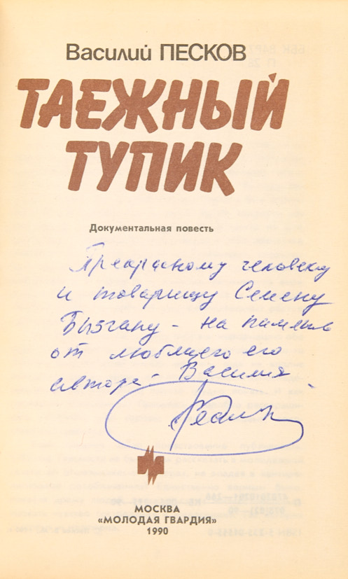 Песков, В. [Автограф]. Таёжный тупик. Документальная повесть. М.: «Молодая гвардия», 1990.