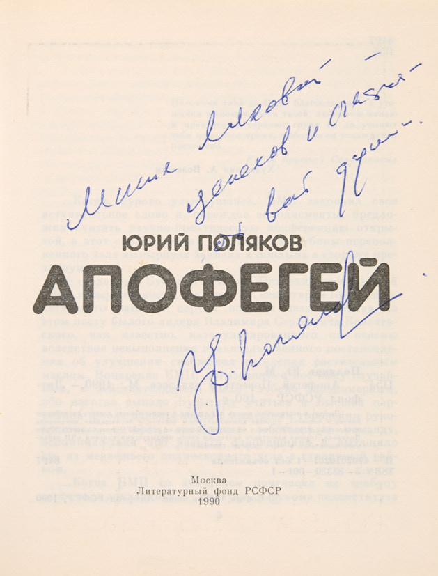 Поляков, Ю. [Автограф?]. Апофегей. М.: Литературный фонд, 1990.