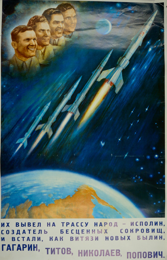 Плакат. Их вывел на трассу народ-исполин, создатель бесценных сокровищ, и встали, как витязи новых былин, Гагарин, Титов, Николаев, Попович. Б.м., [1990].