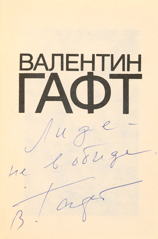 158, [2] с. 17 х 12 см. В цельнотканевом издательском переплете с золотым тиснением. На титульном листе дарственная надпись: «Лиде - / не в обиде. / В. Гафт».
