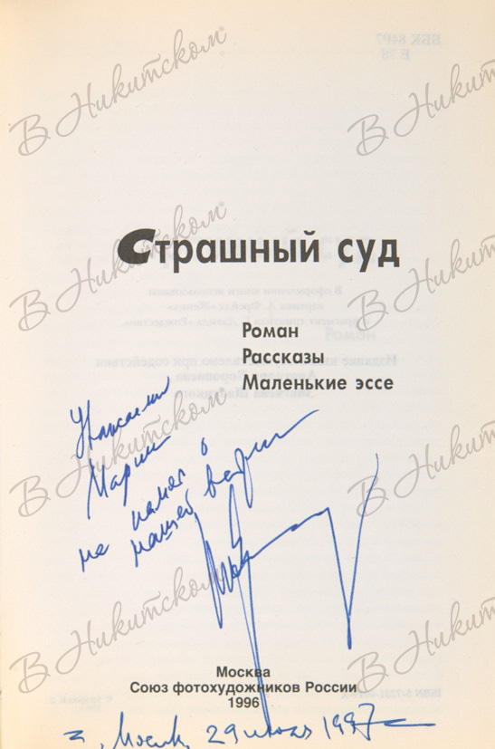 Ерофеев, В. [Автограф]. Страшный суд. Роман. Рассказы. Маленькие эссе. М.: Союз фотохудожников России, 1996.