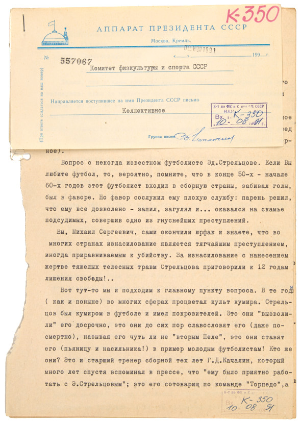 Лакшин, В., Карпов, С. Машинописное письмо М. Горбачеву о насаждении культа футболиста Э. Стрельцова. 1991.