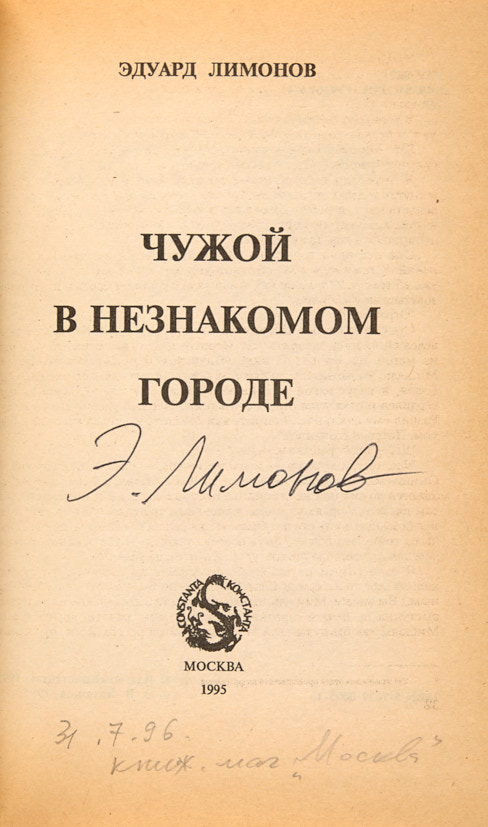 Лимонов, Э. [Автограф]. Чужой в незнакомом городе. М.: Константа, 1995.
