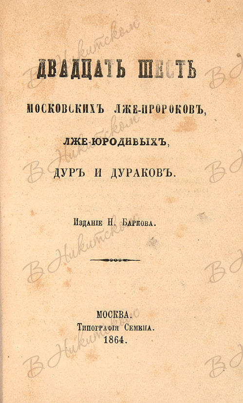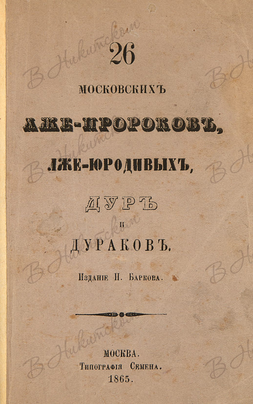 [Прыжов, И.Г.] 26 московских лже-пророков, лже-юродивых, дур и дураков. М.: Издание Н. Баркова; Тип. Семена, 1865.