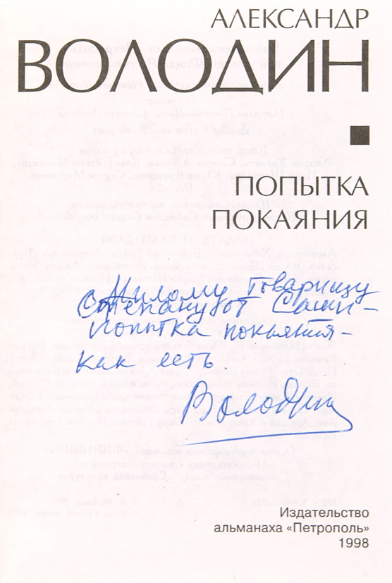 Володин, А. [Автограф?]. Попытка покаяния. СПб.: Издательство альманаха «Петрополь», 1998.
