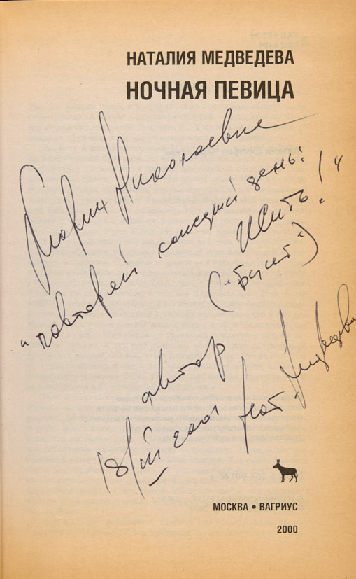 Медведева, Н. [Автограф]. Ночная певица. М.: Вагриус, 2000.
