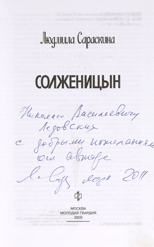 Сараскина, Л. [Автограф]. Солженицын. М.: Молодая гвардия, 2009.