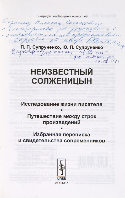Супруненко, П.П. Супруненко, Ю.П. [Автографы]. Неизвестный Солженицын. М.: «ЛЕНАНД», 2014.
