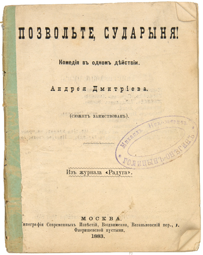 Дмитриев, А. Позвольте, сударыня! Комедия в одном действии. М.: Тип. Современных Известий, 1883.