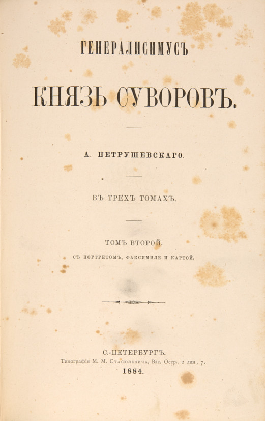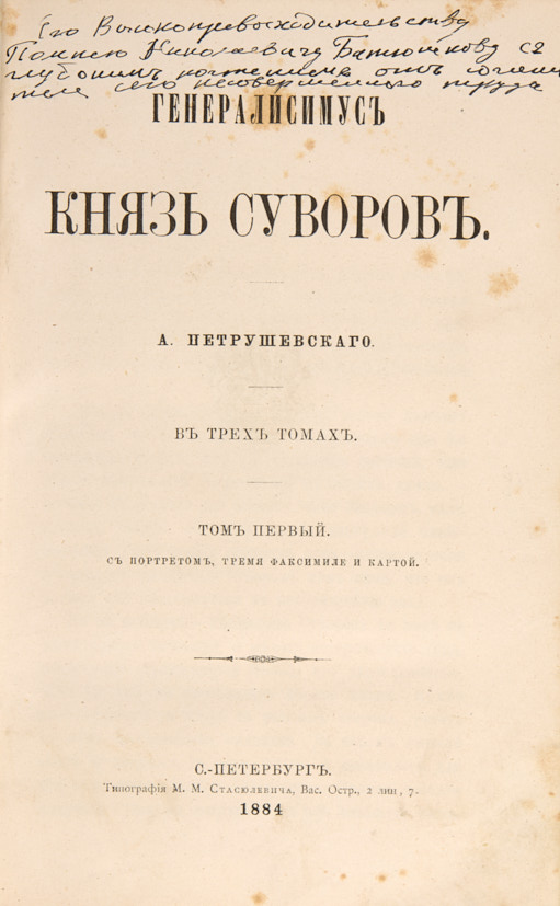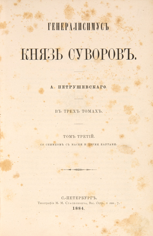 Петрушевский, А. Генералисимус Князь Суворов. [В 3 т.] Т. 1-3. СПб.: Тип. М.М. Стасюлевича, 1884.